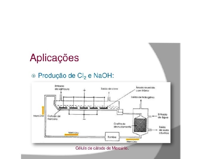 Célula de cátodo de mercúrio (Castner – Kellmer ) processo industrial • Durante a eletrólise da salmoura concentrada, os íons Na+ vão em direção ao cátodo onde são neutralizados. • Na + + e Na (metal ) • Se o cátodo for de mercúrio, os átomos de sódio se dissolvem no mercúrio formando a amálgama. • A amálgama é bombeada para um equipamento denominado desnudador ( separador ) onde água é aspergida(borrifada, orvalhar ) sobre pedaços de grafite. • A água em contato com o sódio dissolvido forma o Na. OH puro a 50% em solução. • O mercúrio retorna ao tanque de eletrólise. • O titânio reveste os anodos que são de aço, os protegendo da corrosão proveniente de reações paralelas.
