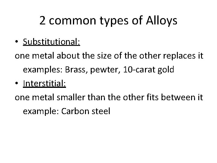 2 common types of Alloys • Substitutional: one metal about the size of the other replaces it examples: Brass, pewter, 10 -carat gold • Interstitial: one metal smaller than the other fits between it example: Carbon steel