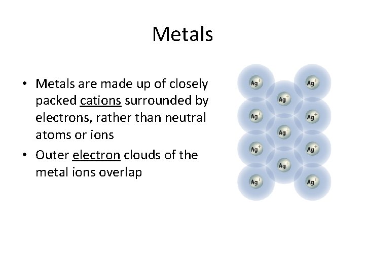 Metals • Metals are made up of closely packed cations surrounded by electrons, rather than neutral atoms or ions • Outer electron clouds of the metal ions overlap