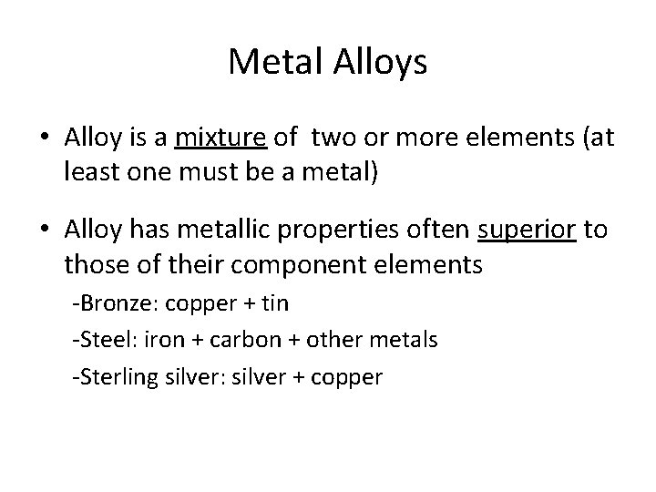 Metal Alloys • Alloy is a mixture of two or more elements (at least one must be a metal) • Alloy has metallic properties often superior to those of their component elements -Bronze: copper + tin -Steel: iron + carbon + other metals -Sterling silver: silver + copper