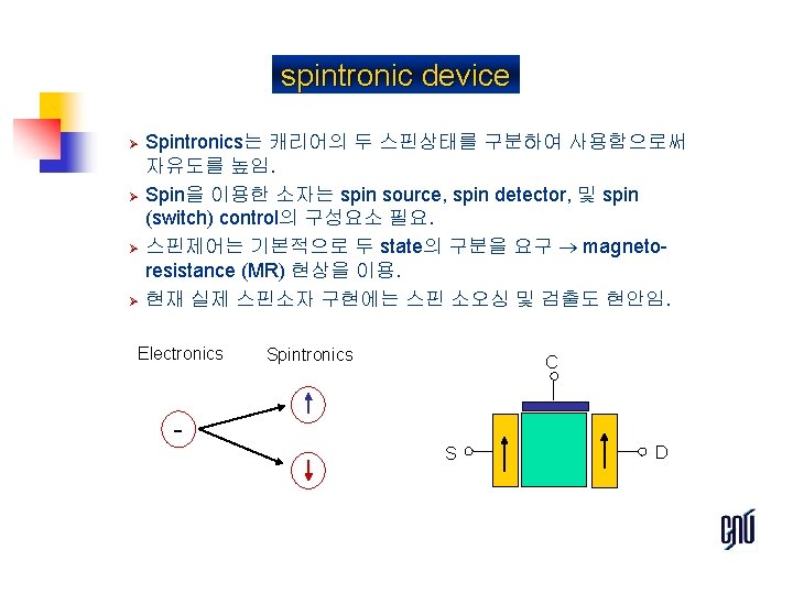spin injection device Ø Ø GMR의 발견과 이를 이용한 reader head, MRAM 등의 개발로 spin electronics 연구의 활성화. 당면한 문제점은 효율적인 spin injection. § § Ø 고스핀분극 injector 재료 및 구조 고주입효율 (Injector medium 및 medium detector) 재료 및 구조 스핀제어 구조. spin injector spin controller spin detector spin transport medium