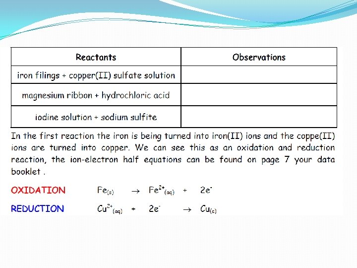 (9. 16) Redox Reactions Try these three experiments: � 1. Pour out 2 cm depth of copper(II) sulfate solution into a test-tube, add a spatula of iron filings. Put a rubber bung in and shake. Observe what happens. � 2. Pour out 2 cm depth of hydrochloric acid into a test-tube and add a strip of magnesium ribbon. Observe what happens. � 3. Pour out 2 cm depth of iodine solution into a test-tube and add a spatula of sodium sulfite. Observe what happens.