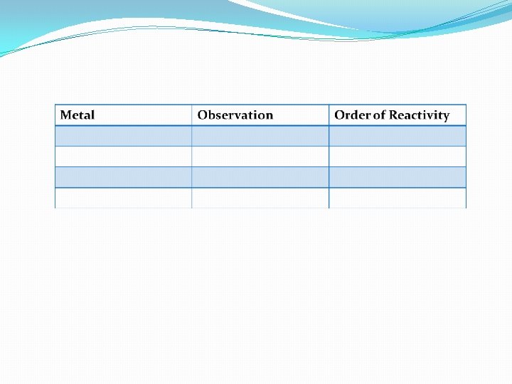Table of results: Metal Observation Order of Reactivity