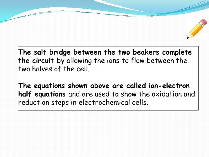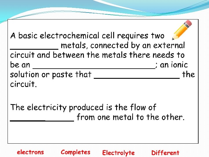 Learning Intentions and Success Criteria �Learning Intention �To learn about the different components of an electrochemical cell �To learn about the significance of electrochemical cells within chemistry �Success Criteria �I can recall information about the electrochemical series �I can interpret data within the data booklet �I can differentiate the different components of the electrochemical cell �I can distinguish the accepting metal and receiving metal within the electrochemical cell
