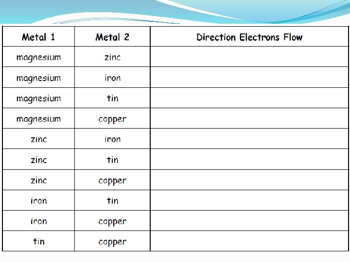 Summary of experiment As the electrons flow from one metal to the other, one metal must donate electrons and the other accept them. You can see from the table that some metals are better at donating electrons and some metals better at accepting them. If we place the metals in order of their ability to donate electrons we form what is known as the electrochemical series. Metals good at donating electrons are at the top and the metals at the bottom are better at accepting electrons.