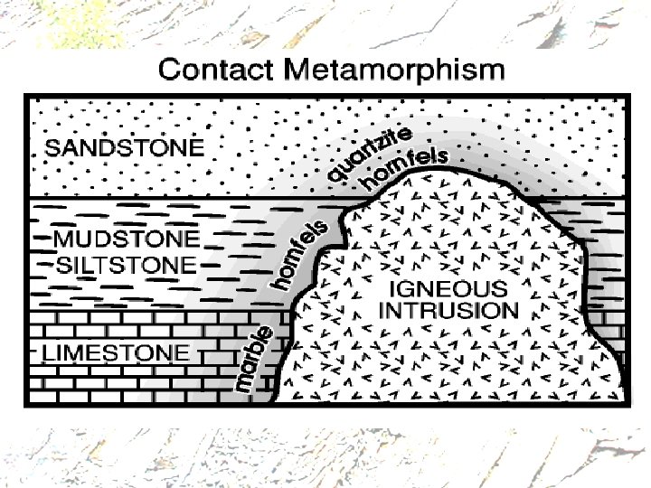 Contact Metamorphism- occurs locally, adjacent to an igneous intrusion or along fractures that are in contact with hot gases or condensation. The greatest intensity of metamorphism occurs at the point of interaction between the host rock and magma.