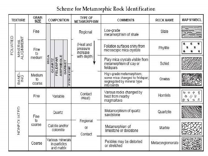 How can you tell if a rock is METAMORPHIC? Look for Banding or Foliation of Mineral Crystals (NOT layering of sediment grains) Look for evidence of deformation, like intense folding Look for new mineral crystals forming in the rock (garnet)