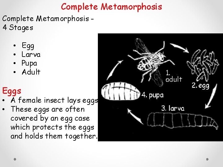 Complete Metamorphosis 4 Stages • • Eggs Egg Larva Pupa Adult • A female insect lays eggs. • These eggs are often covered by an egg case which protects the eggs and holds them together.