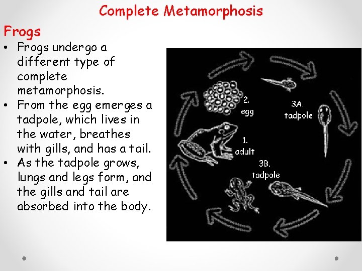 Complete Metamorphosis Frogs • Frogs undergo a different type of complete metamorphosis. • From the egg emerges a tadpole, which lives in the water, breathes with gills, and has a tail. • As the tadpole grows, lungs and legs form, and the gills and tail are absorbed into the body.
