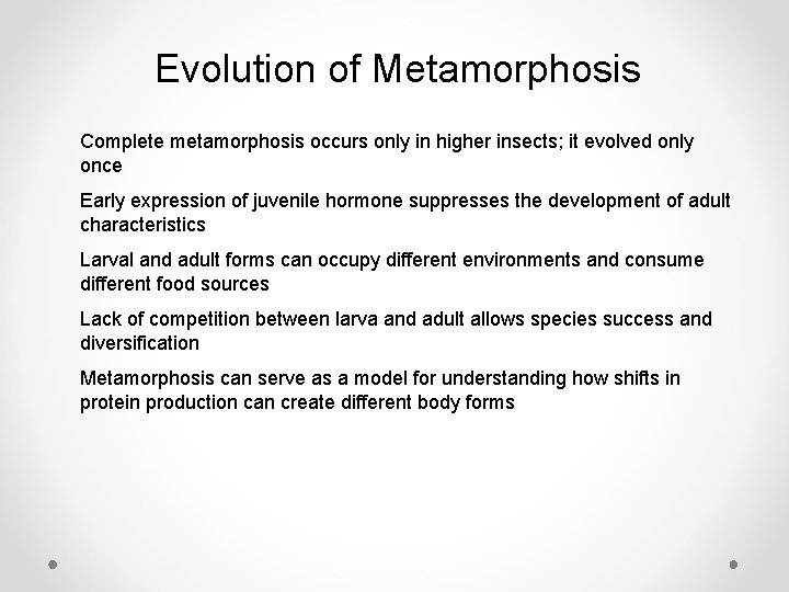 Evolution of Metamorphosis Complete metamorphosis occurs only in higher insects; it evolved only once Early expression of juvenile hormone suppresses the development of adult characteristics Larval and adult forms can occupy different environments and consume different food sources Lack of competition between larva and adult allows species success and diversification Metamorphosis can serve as a model for understanding how shifts in protein production can create different body forms