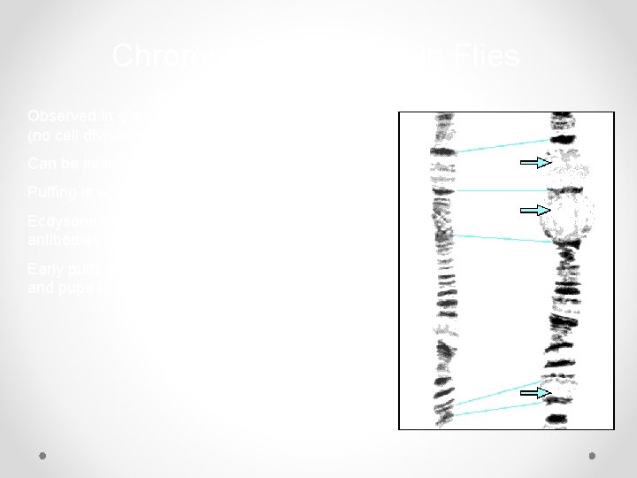 Chromosome Puffing in Flies Observed in giant salivary gland chromosomes (no cell division after replication) Can be inhibited by actinomycin Puffing is where transcription is occurring. Ecdysone can be detected by fluorescent antibodies localized to the puffing Early puffs and late puffs seen in larva to pupa and pupa to adult molt