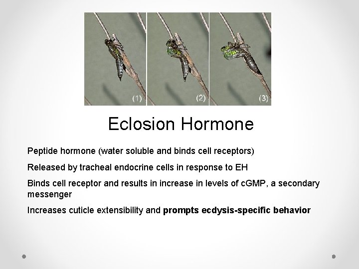 Eclosion Hormone Peptide hormone (water soluble and binds cell receptors) Released by tracheal endocrine cells in response to EH Binds cell receptor and results in increase in levels of c. GMP, a secondary messenger Increases cuticle extensibility and prompts ecdysis-specific behavior