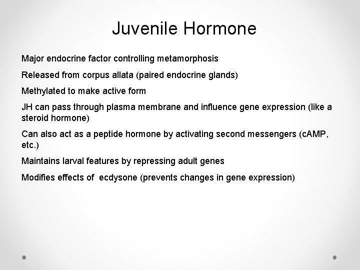 Juvenile Hormone Major endocrine factor controlling metamorphosis Released from corpus allata (paired endocrine glands) Methylated to make active form JH can pass through plasma membrane and influence gene expression (like a steroid hormone) Can also act as a peptide hormone by activating second messengers (c. AMP, etc. ) Maintains larval features by repressing adult genes Modifies effects of ecdysone (prevents changes in gene expression)