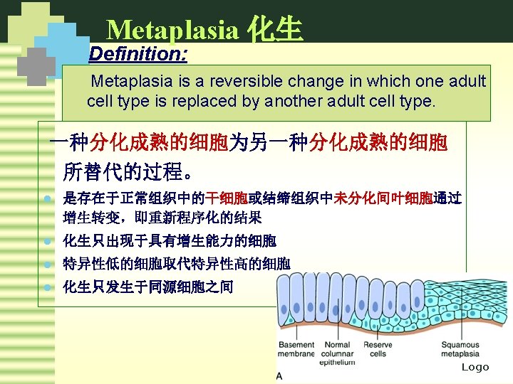 Metaplasia-Types Epithelial metaplasia Squamous metaplasia columnar epithelium (trachea, cervix, 鳞状上皮化生 cholecyst) transitional epithelium (pelvis) Intestinal metaplasia Gastric glandular epithelium 肠上皮化生 Pseudo-pyloric gland Metaplasia 假幽门腺化生 corpus and sinus gastric gland Mesenchymal metaplasia Osseous, cartilage and adipose tissue metaplasia 骨、软骨、脂肪组织化生 Fibroblasts Logo