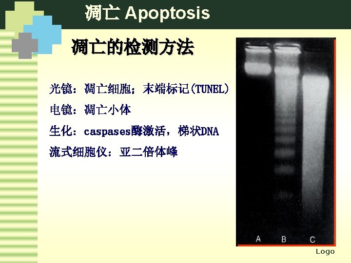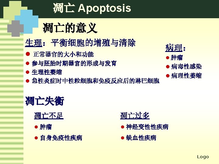 凋亡 Apoptosis 1972, “falling off” l A form of cell death l A way to eliminate unwanted host cells through activation of a coordinated, internally programmed series of events l 凋亡是活体内个别细胞程序性细胞死亡(programmed cell death)的表现形式,是由体内外因素触发细胞内 预存的死亡程序而导致的细胞主动性死亡方式,在形态 和生化特征上都有别于坏死。 是正常细胞群体中单个细胞的死亡。 A single cell death in living bodies controlled by the genes which is a energy-dependent suicide process. Logo