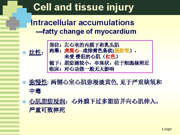 Cell and tissue injury Reversible injury--fatty change Definition: The accumulation of fat in non-fatty parenchymal cells. 脂肪变: 实质细胞内脂肪的异常蓄积 Liver, heart, kidneys and other organs Gross: enlarges, yellow, soft, and greasy. LM: The fatty change appears as clear vacuoles within parenchymal cells. 肉眼: 器官体积增大,淡黄色,边缘圆钝,切面呈油腻感 光镜: 细胞内出现边缘较整齐的大小不等的圆形空泡, 苏丹Ⅲ呈桔红色,锇酸呈黑色 Logo