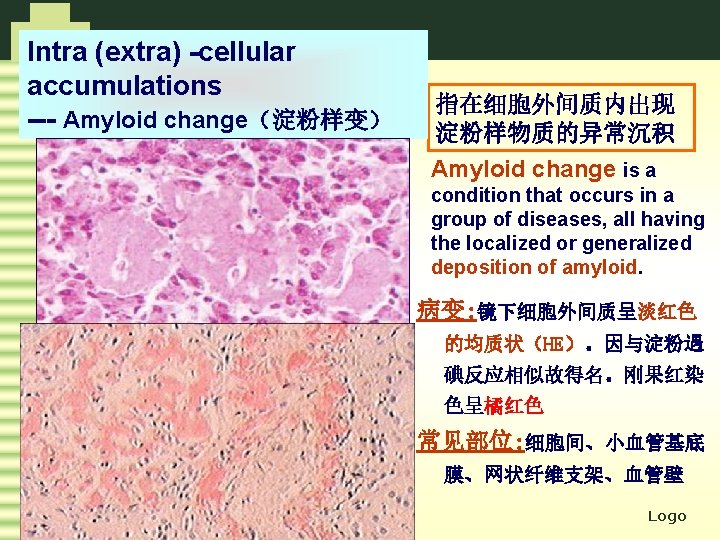 Cell and tissue injury Intra(extra) cellular accumulations ---Mucoid change 粘液样变 Change characterized by accumulation of mucin in intracellular or extracellular loci. 指间质内有粘多糖和蛋白质的蓄积 病变: 镜下间质疏松, 多突起的星芒纤维细 胞散在于灰兰色的粘 液样基质中 常见部位: 胶原病, 如 风湿病等, 动脉粥样 硬化及间叶组织肿瘤 基质中 Logo