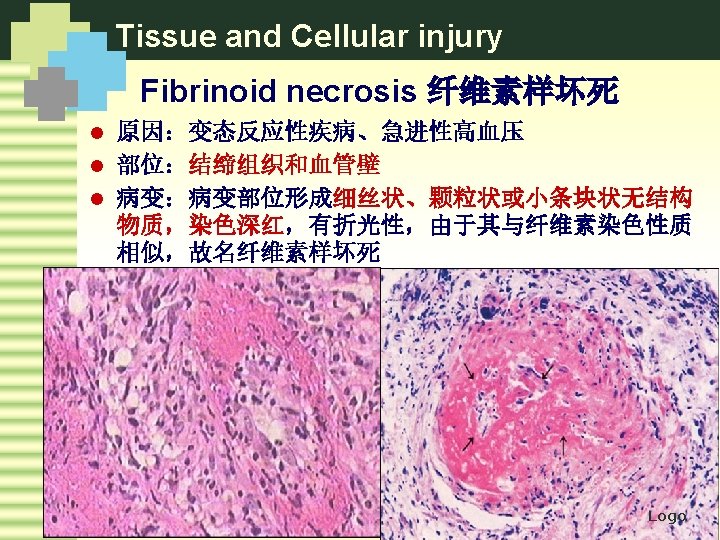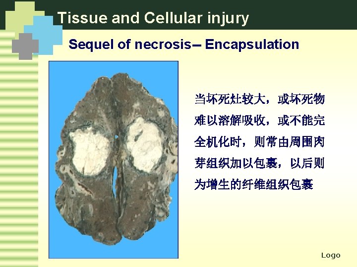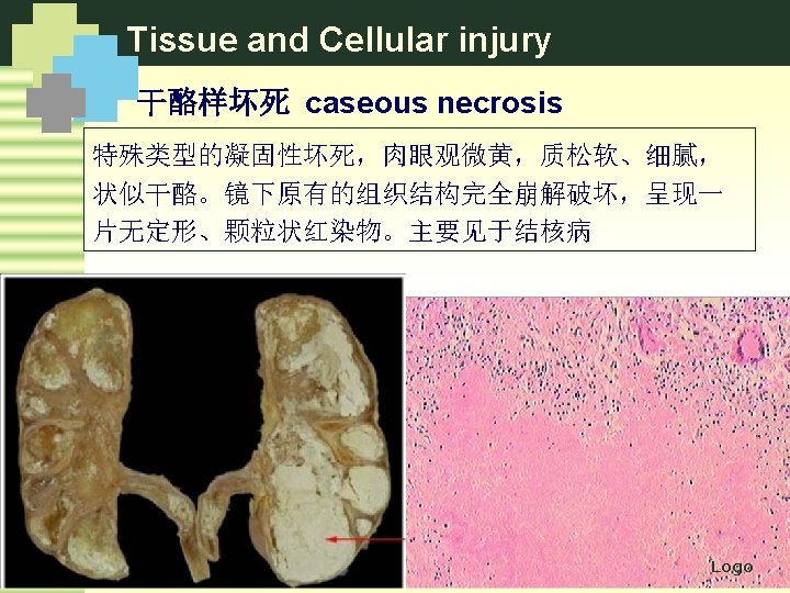 Tissue and Cellular injury Special types of necrosis u 干酪样坏死 Caseous necrosis u 坏疽 Gangrene u 脂肪坏死 Fat necrosis u 纤维素样坏死 Fibrinoid necrosis Logo