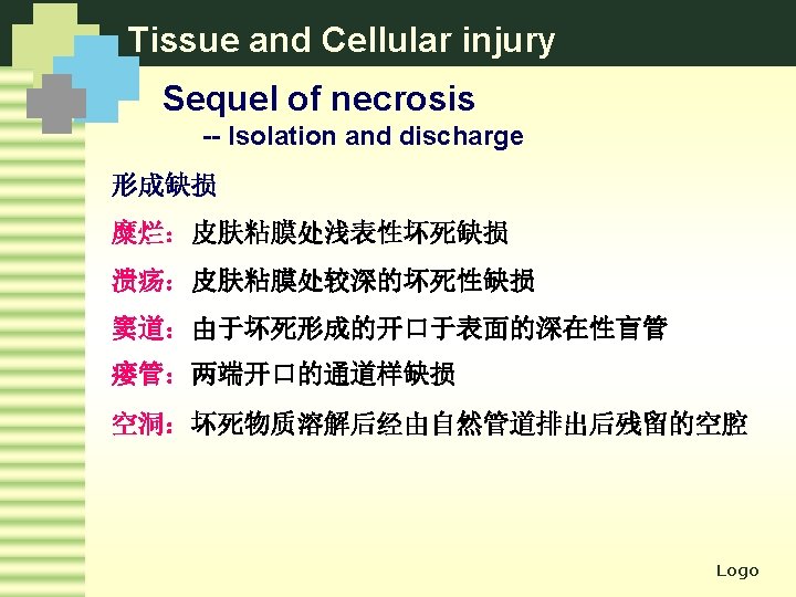 Tissue and Cellular injury Irreversible injury --Cell death 细胞死亡 细胞受到严重损伤累及细胞核时,呈现代谢停止、 结构破坏和功能丧失等不可逆性改变即细胞死亡 Severe damage involve nucleus Metabolism stop Structure destroy Function lose Irreversible injury Cell death necrosis apoptosis Logo