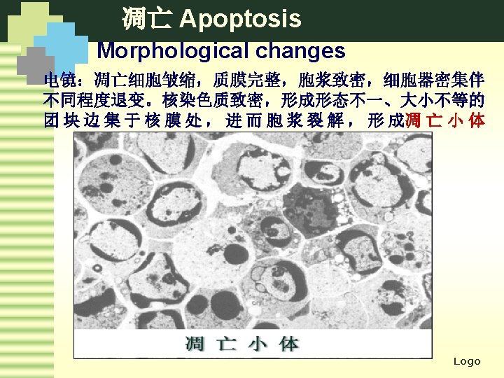 凋亡 Apoptosis Morphological changes LM: Single cells or small clusters of cells Round or oval mass of eosinophilic cytoplasm with dense nuclear chromatin fragments 凋亡小体多呈圆形或卵圆形,大小不等,胞浆浓缩,强嗜 酸性,核染色质浓集呈紫蓝色致密的球状 Logo