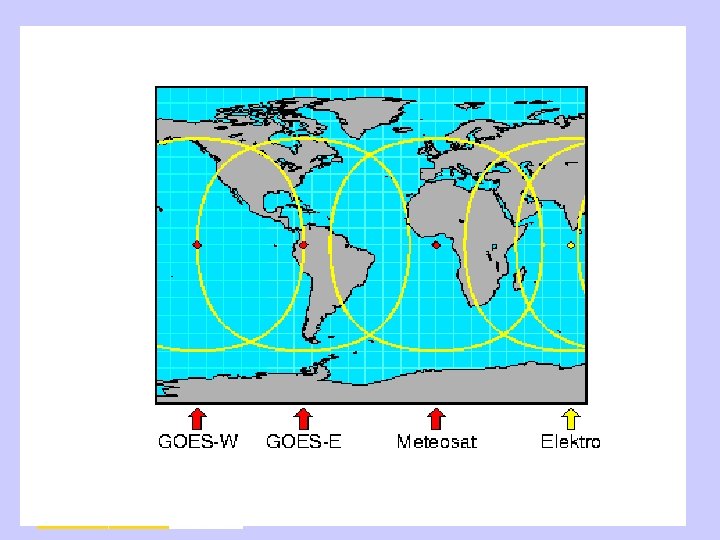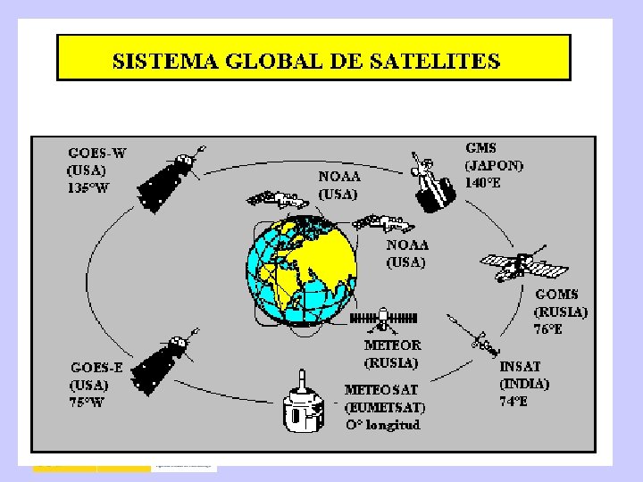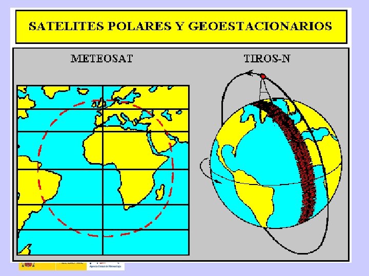 SATÉLITES METEOROLÓGICOS • Geoestacionarios ü Están a 36. 000 km. de la Tierra ü Giran con la Tierra • Heliosíncronos o polares ü Están a 800 km. de la Tierra ü Pasan por los polos