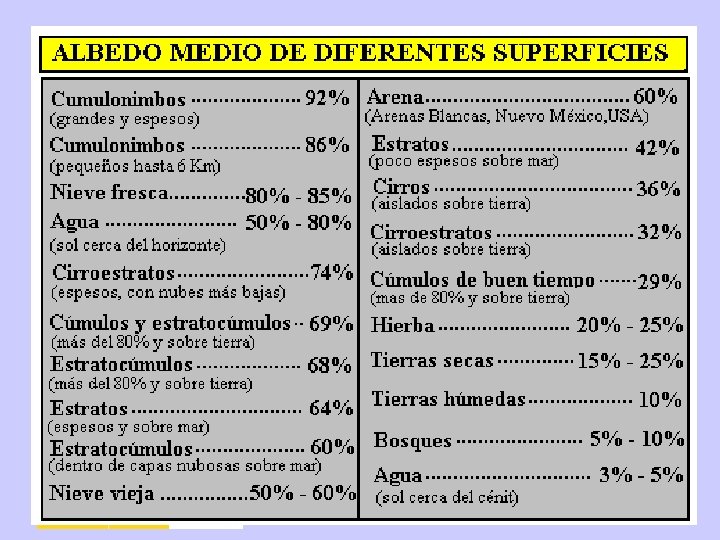 CONCEPTOS BÁSICOS • Atmósfera. - Casi transparente para la radiación solar; refleja parte de la radiación terrestre. • Nubes. - Reflejan parte de la radiación solar y de la radiación terrestre