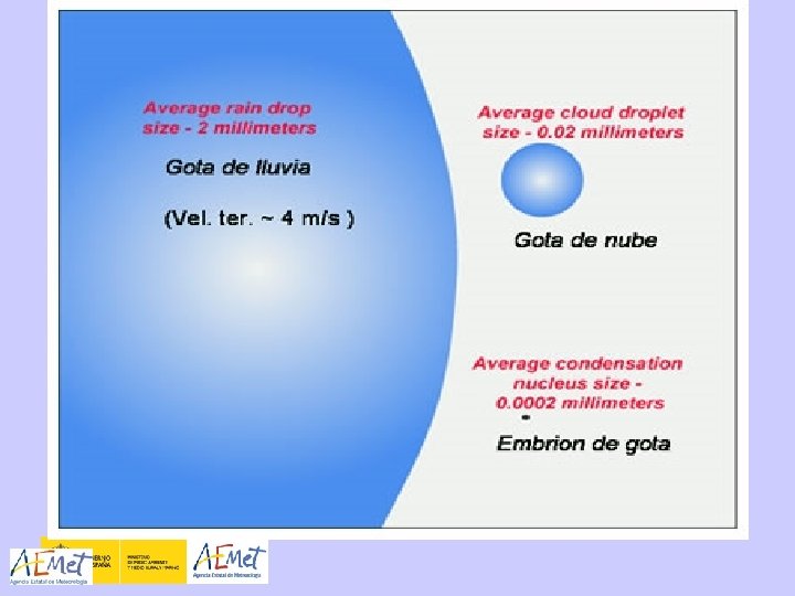 GOTAS • Núcleos de condensación • Crecimiento por coalescencia y por colisión • Velocidad caída función del tamaño de la gota y de la velocidad de ascenso Delegación Territorial en Madrid