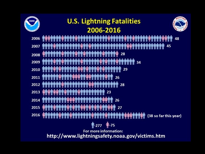 Death and Injury • Lighting deaths average around 40 per year in the USA • Lighting causes 2. 5 times more injuries per year than deaths • Men are injured significantly more often than women