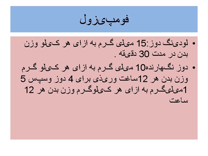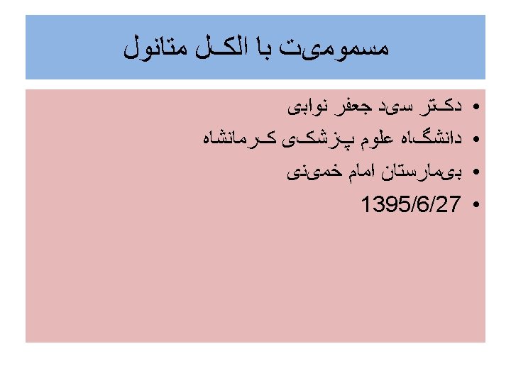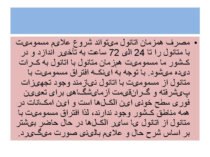 ﺩﺭﻣﺎﻥ ﺑﺎ ﺍﺗﺎﻧﻮﻝ • 1 ml/kg/w: 10 -20 %ethanol, louding dose • 0/16 ml/kg/q 1 h. oral or NGT. maintenance • Durin dialysis double maintanance dose