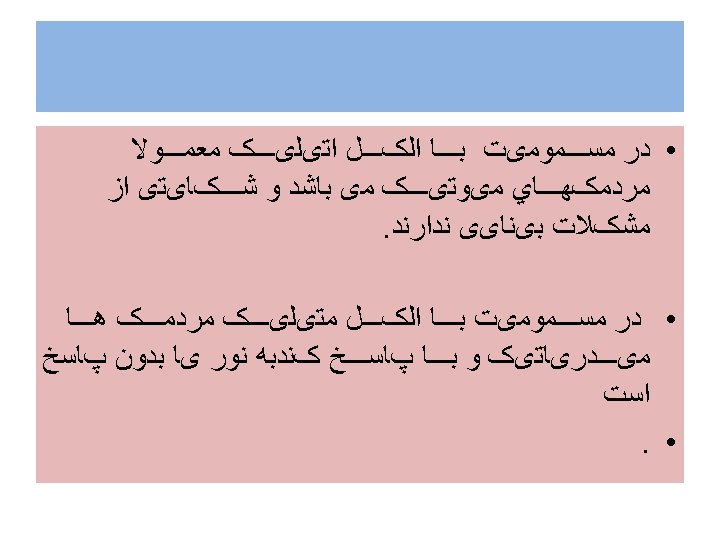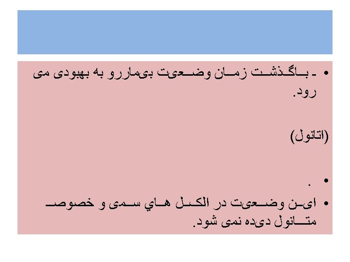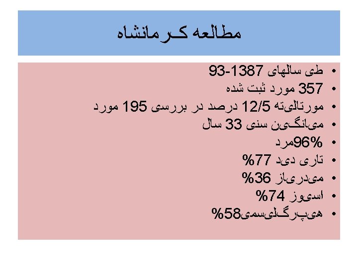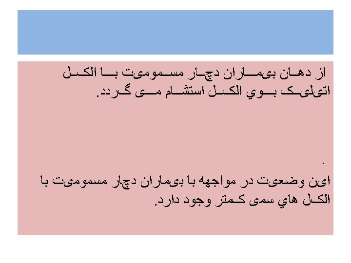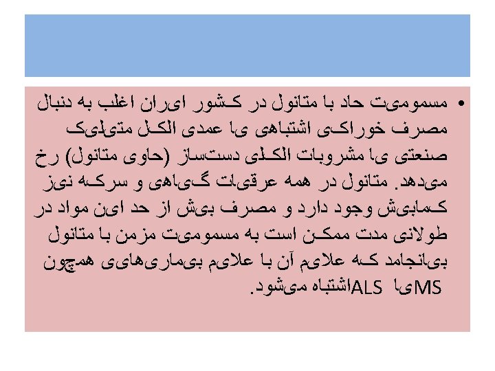 Indications for. Hemodialysis (1)- Greater than 30 m. L of methanol ingested, (2) -Serum methanol level greater than 20 mg/d. L (3)- Observation of visual complications (4) -No improvement in acidosis despite repeated sodium bicarbonate infusions. • 5 - کﺎﻫﺶ ﺳﻄﺢ ﻫﻮﺷیﺎﺭی • 6 - ﻧﺎﺭﺳﺎیی کﻠیﻪ • 7 - ﺑﺪﺗﺮ ﺷﺪﻥ ﺣﺎﻝ ﺑیﻤﺎﺭ ﻋﻼﺭﻏﻢ ﺩﺭﻣﺎﻥ • •