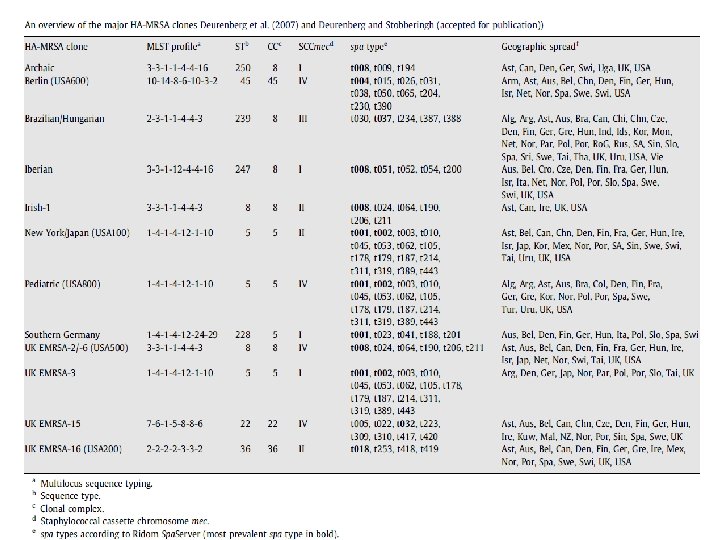 • MRSA cultured from patients with these risk factors are known as HA-MRSA. • major clones that disseminated internationally: Iberian, v Brazilian, v Hungarian, v New York/Japan, and v Paediatric clones • CA-MRSA is cultured from healthy and young individuals without any of these clinical risk factors.