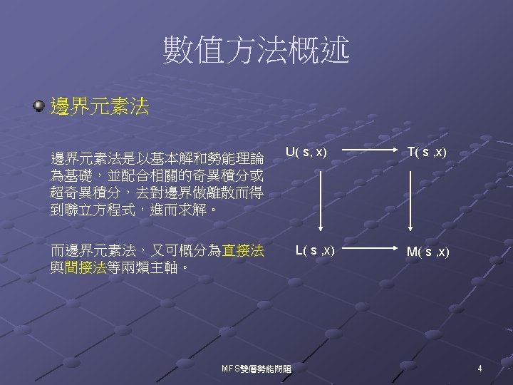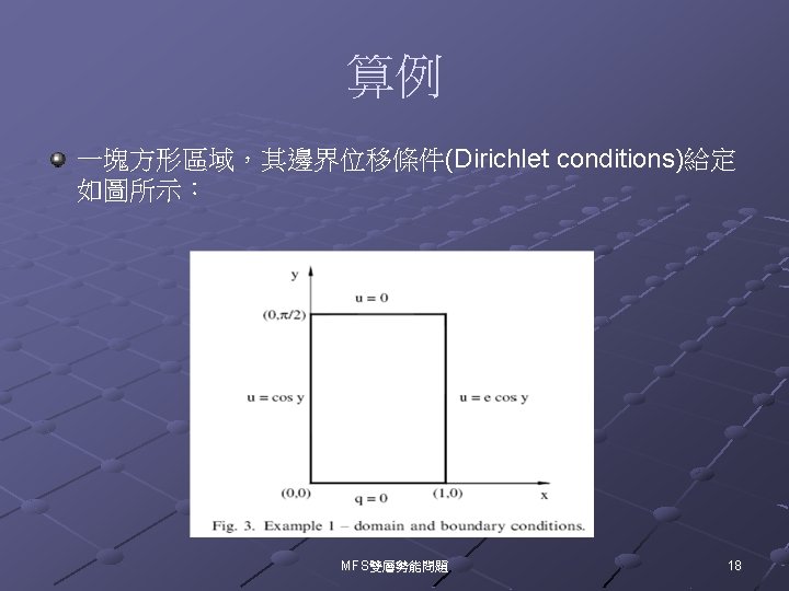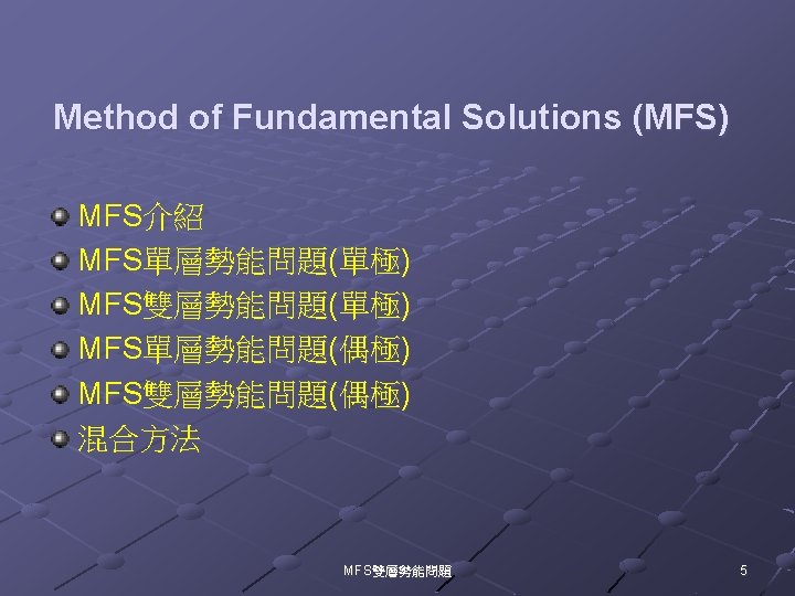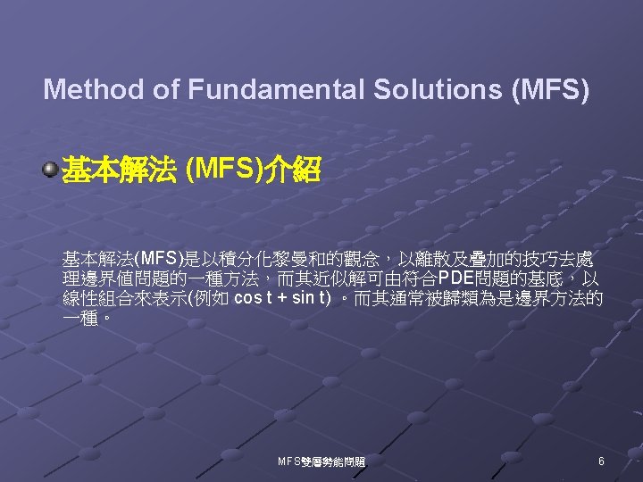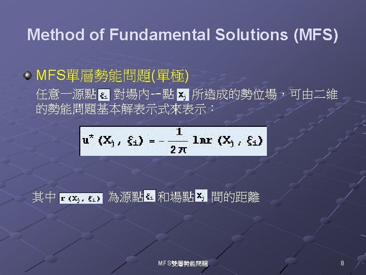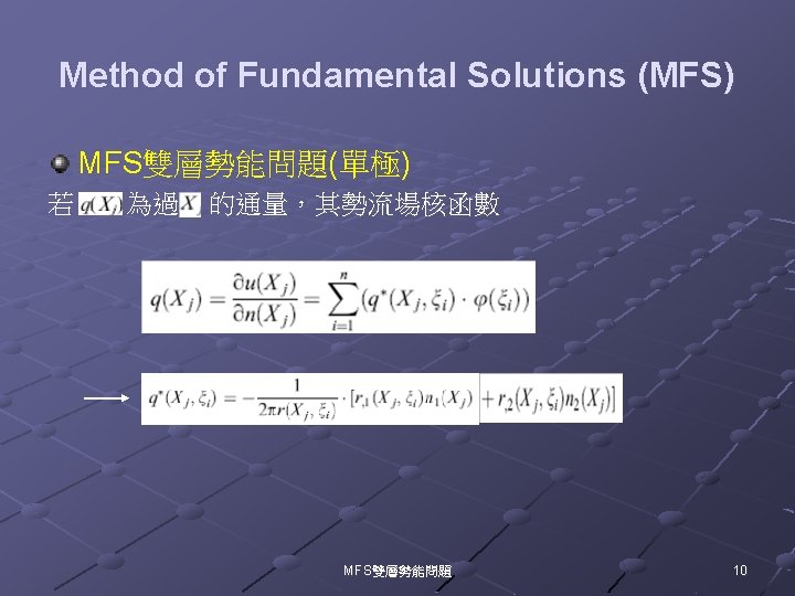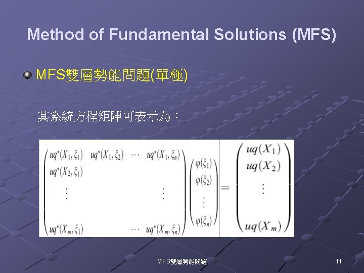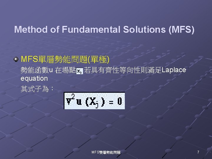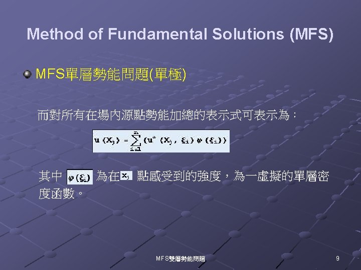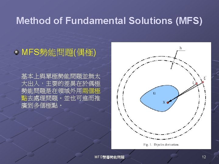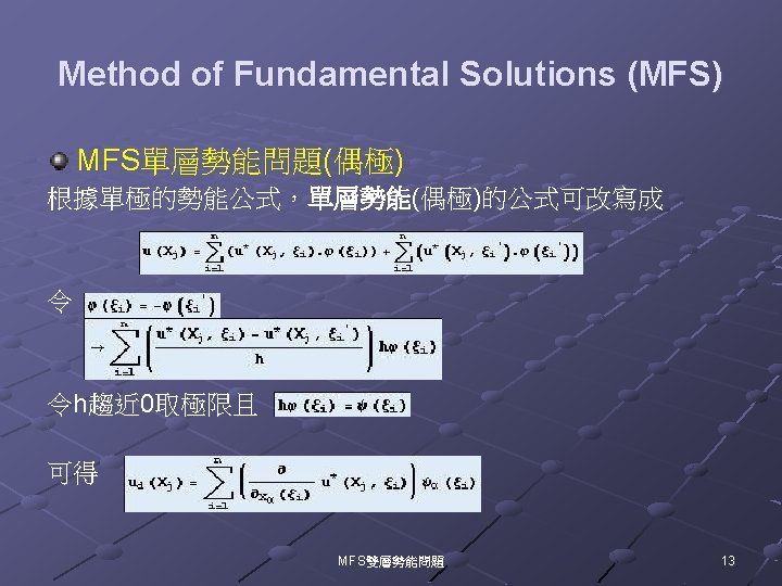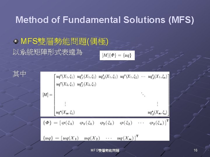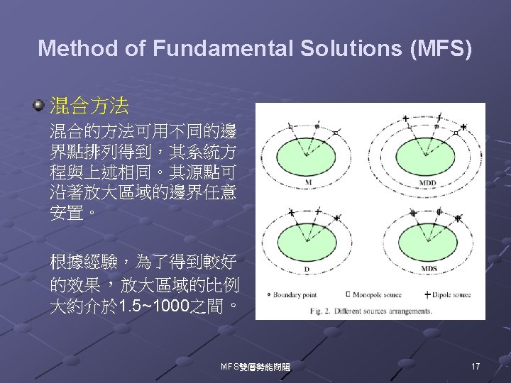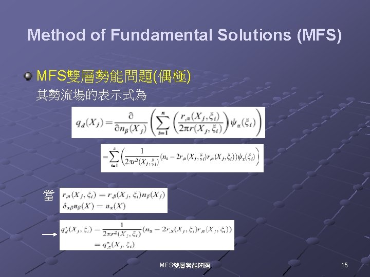 Method of Fundamental Solutions (MFS) MFS單層勢能問題(偶極) 又 代入整理可得 其中 MFS雙層勢能問題 14