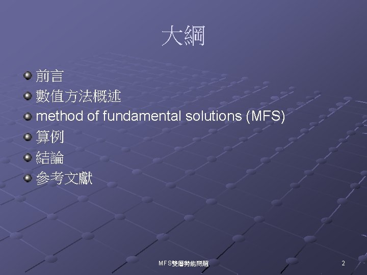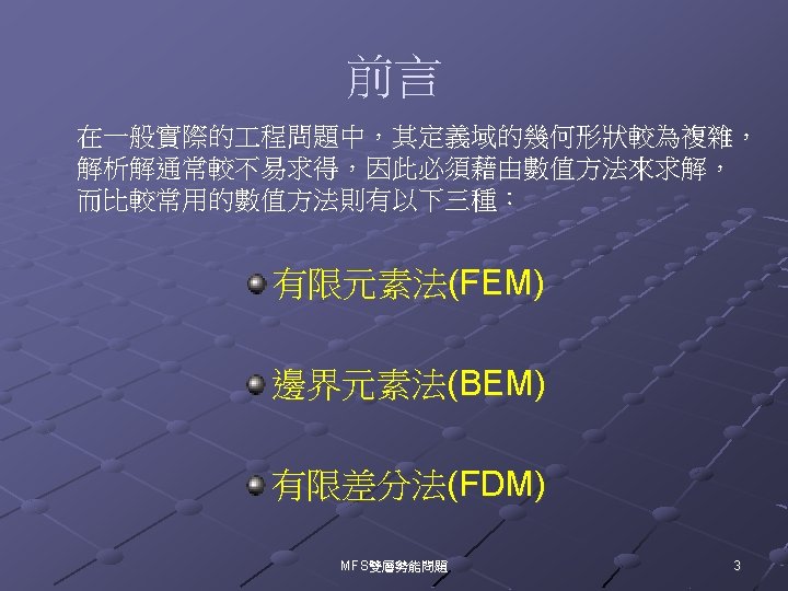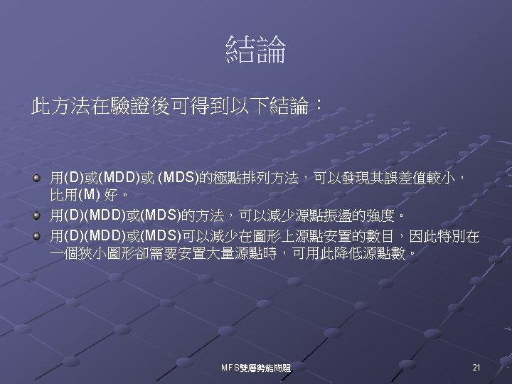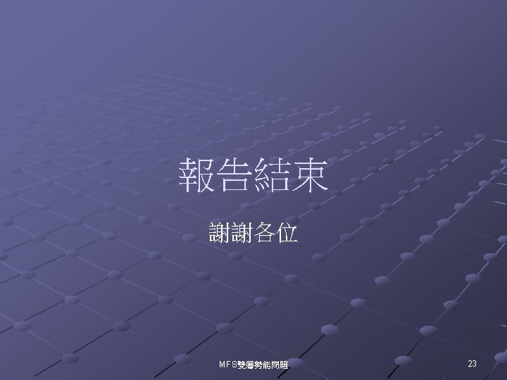 參考文獻 Dipoles formulation for the method of fundamental solutions~applied to potential problems~George S. A. Fam Youssef F. Rashed~The British University in Egypt (BUE), P. O. Box 43, El-Sherouk City 11837, Egypt THE METHOD OF FUNDAMENTAL SOLUTIONS: A WEIGHTED LEAST{SQUARES APPROACH~YIORGOS{SOKRATIS SMYRLIS http: //www 2. nsysu. edu. tw/csmlab/fem/project/ansysprj. htm 邊界元素法~陳正宗、洪宏基 教授 MFS雙層勢能問題 22