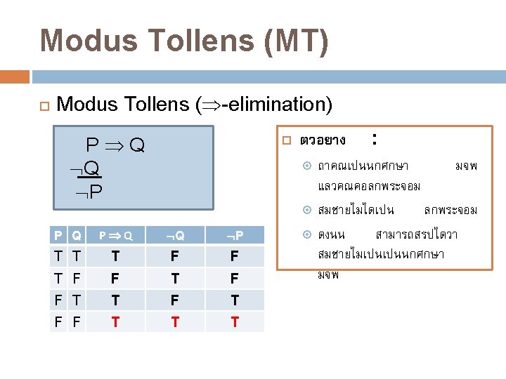 Simplification (Simp) Simplification ( -elimination) P Q P หรอ P Q Q P Q P Q T T T T F F F F F