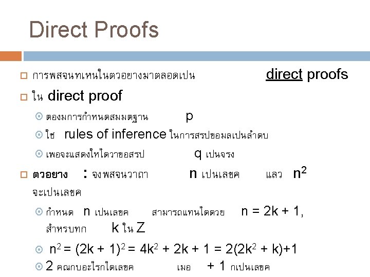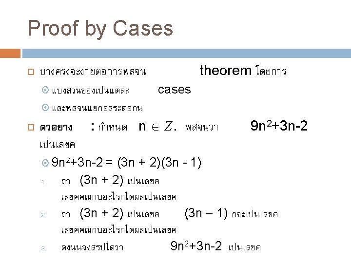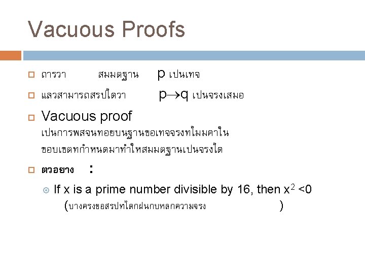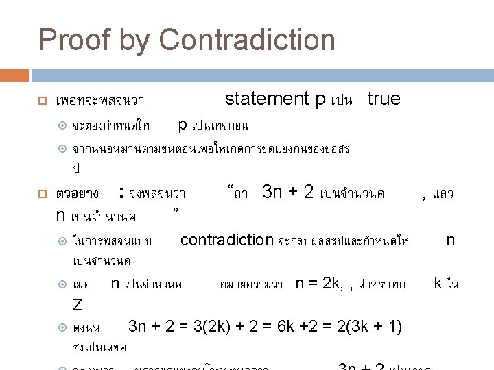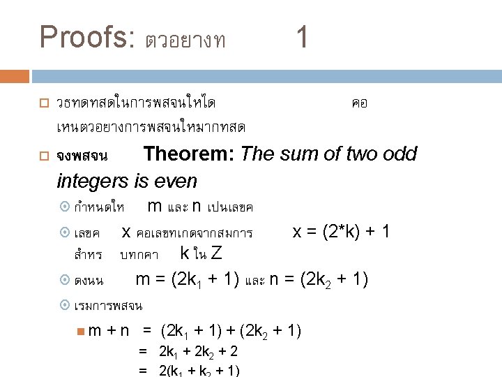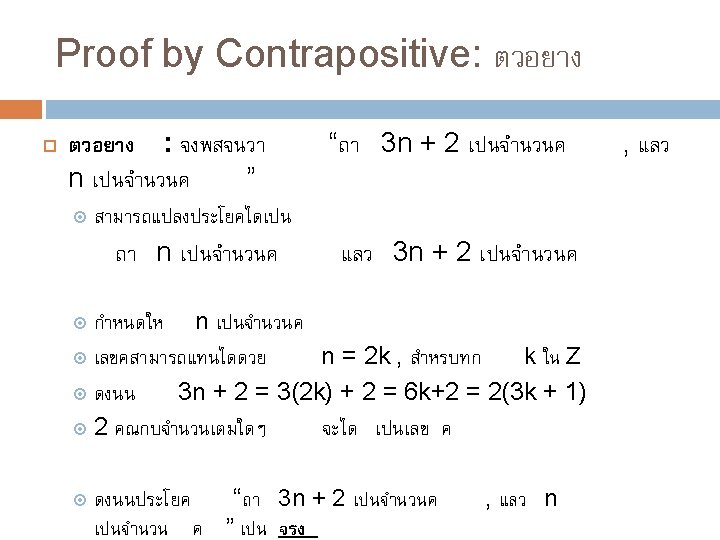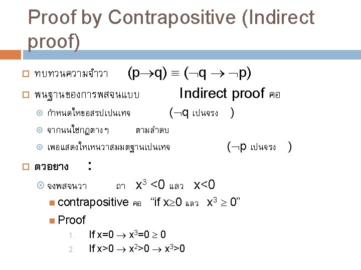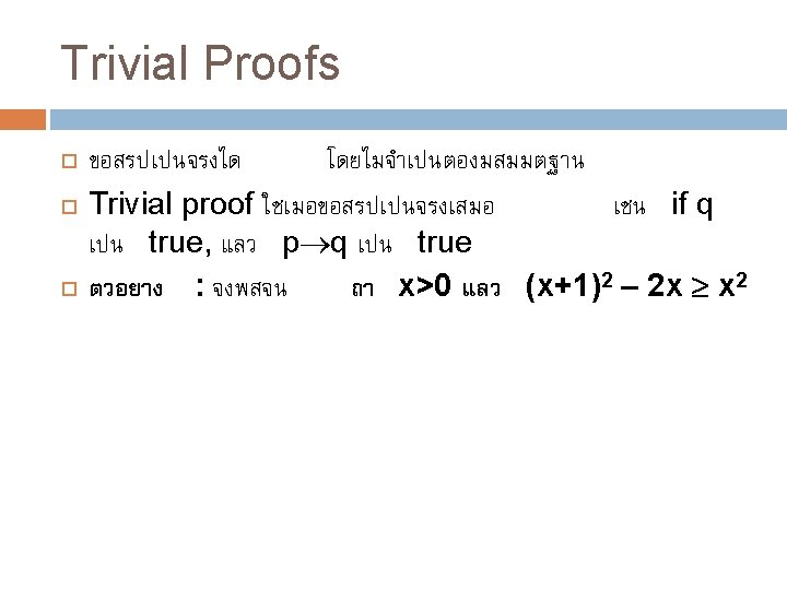 วธการ Proofs Trivial proofs Vacuous proofs Direct proofs Proof by Contrapositive (indirect proof) Proof by Contradiction (indirect proof, aka refutation) Proof by Cases (sometimes using WLOG) Proofs of equivalence Existence Proofs (Constructive & Nonconstructive)