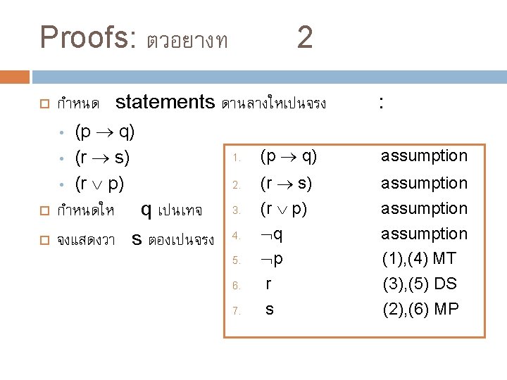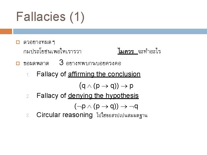 ทบทวน Rule of References อกนด Affirming the antecedent: Modus ponens (p q)) q Denying the consequent: Modus Tollens ( q (p q)) p Affirming the conclusion: Fallacy (q (p q)) p Denying the hypothesis: Fallacy ( p (p q)) q