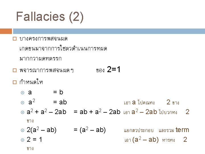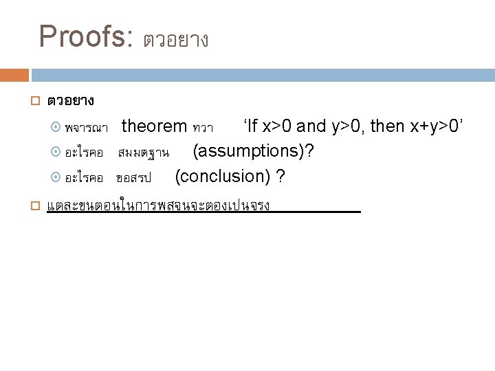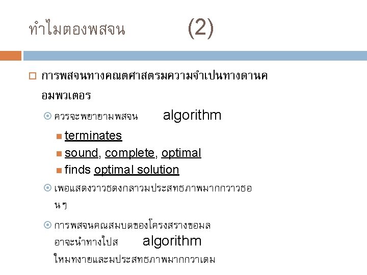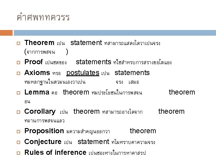 ทำไมตองพสจน (1) “Mathematical proofs, like diamonds, are hard and clear, and will be touched with nothing but strict reasoning. ” -John Locke Mathematical proofs are, in a sense, the only true knowledge we have They provide us with a guarantee as well as an explanation (and hopefully some insight)