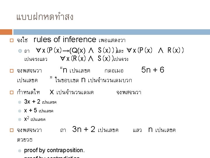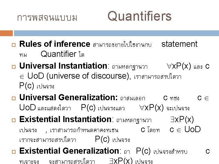ตวอยาง G(x): “x is in the garage” E(x): “x has an engine problem” S(x): “x has been sold” Universe of discourse คอ ดงนนจะไดสมมตฐานทวา Quantifier จงแสดงวาเมอรวา “A car in the garage has an engine problem” และ “Every car in the garage has been sold” สามารถสรปไดวา “A car has been sold has an engine problem” กำหนด : การพสจนแบบม รถทงหมด : x (G(x) E(x)) x (G(x) S(x)) ขอสรปทตองการคอ x (S(x) E(x))