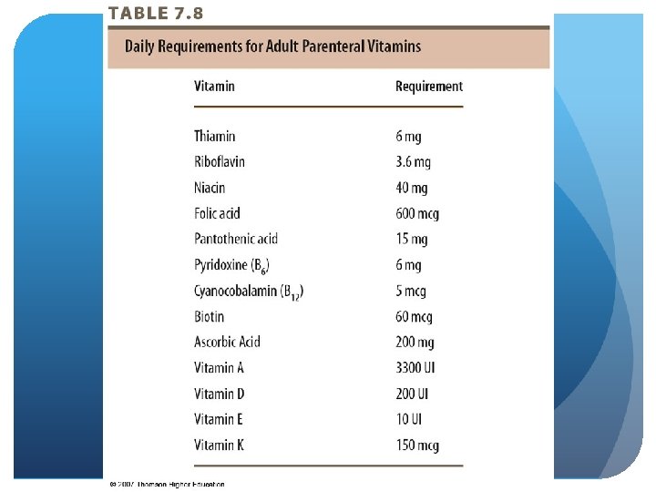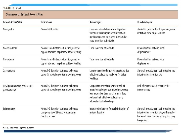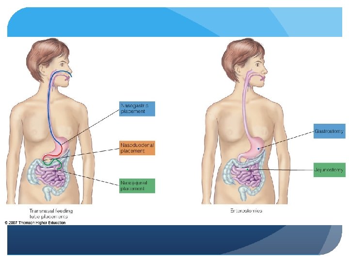 Enteral Nutrition Feeding techniques/ delivery methods Bolus feedings Intermittent feedings Continuous feedings © 2007 Thomson - Wadsworth