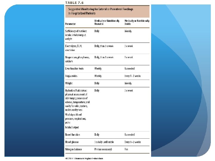 Enteral Nutrition Monitoring for complications Dehydration Tube Feeding Syndrome Electrolyte Imbalances Underfeeding or Overfeeding Hyperglycemia Refeeding Syndrome Monitor serum phosphorus, mg, potassium