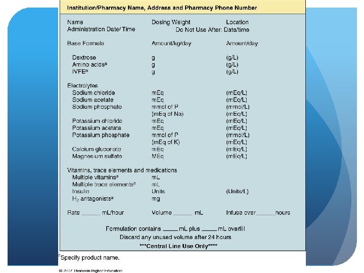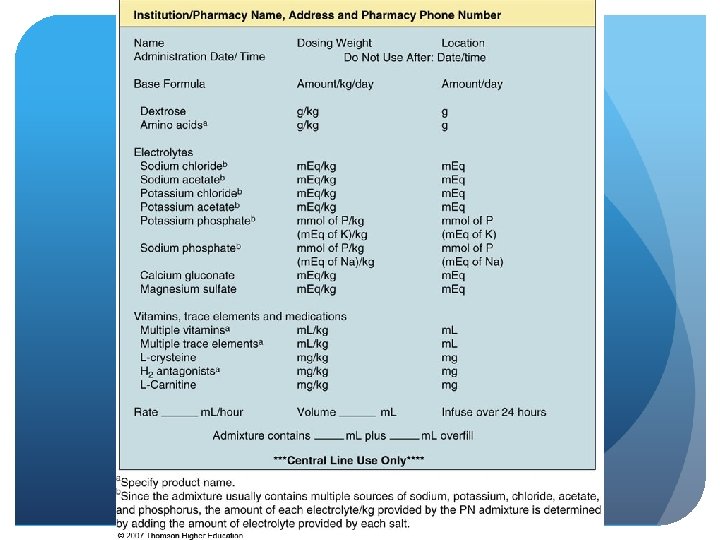 Parenteral Nutrition Solutions Electrolytes DRI standards used Vitamins/Minerals Trace minerals Medications