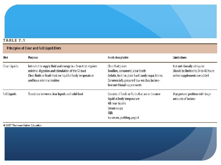Oral diets Texture modifications Soft diets Liquid diets Clear liquid Full liquid Consider osmolality Preparation for a specific medical test