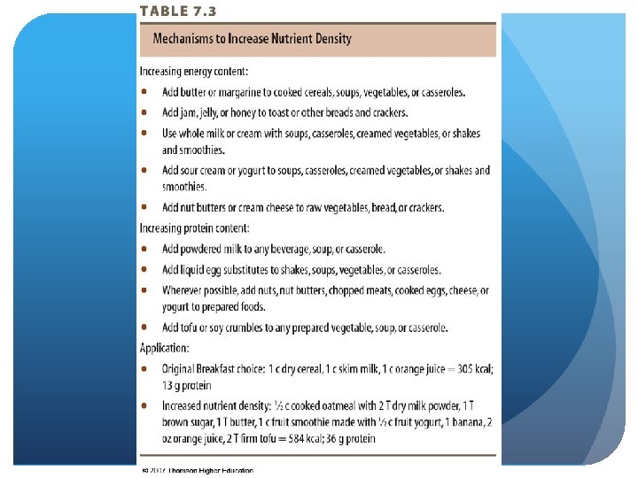Oral Supplements Goal: Increase nutrient density without increasing volume Snacks Liquid meal replacement formulas Modular products Commercial supplements