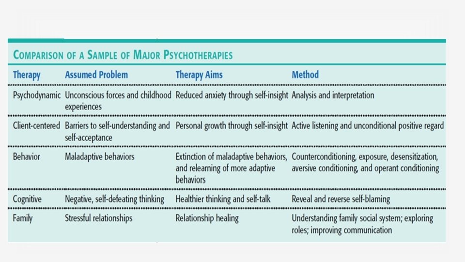 Evaluating Psychotherapeutic Approaches A meta-analysis gathers large amounts of data from a variety of sources and then presents the data in a single report § Cognitive, behavior, and interpersonal therapies effective for treating depression § Cognitive, behavior, and exposure therapies good for treating phobias, panic disorders, and OCD § Cognitive-behavior therapy good for treating disorders § Behavior modification good for treating bed-wetting § Psychoanalysis good for treating borderline personality disorder, and substance abuse disorders