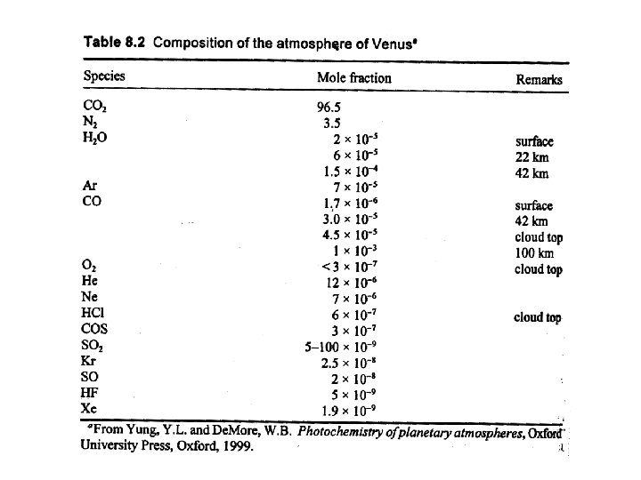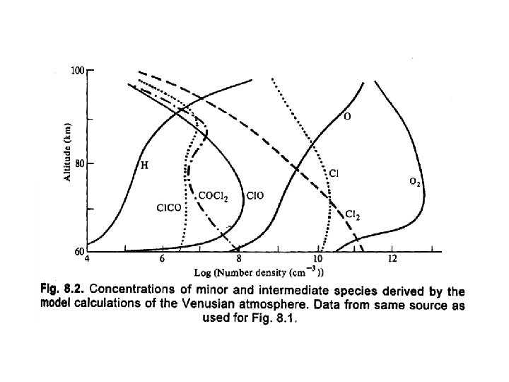 Stratospheric chemistry • Given the low abundance of molecular oxygen in the Venus atmosphere where does the O come from – probably from the breakdown of sulfur dioxide: SO 2 + hν → SO + O SO + hν → S + O SO + SO → S + SO 2