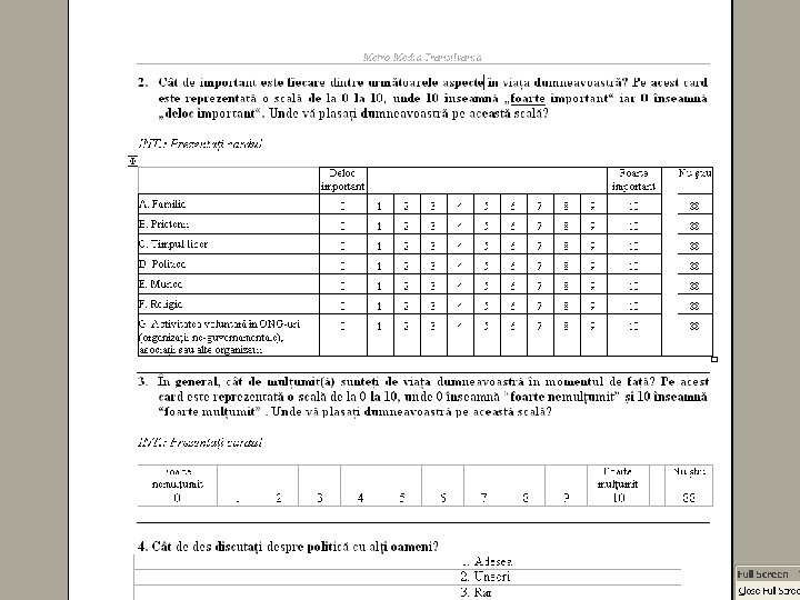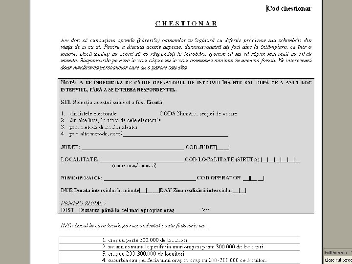 CONSIDERATII GENERALE • Design the questionnaire to fit the medium. Phone interviews cannot show pictures. Survey by mail respondents cannot ask, “What exactly do you mean by that? ” if they do not understand a ques tion. Intimate, personal questions are sometimes best handled by mail or computer, where anonymity is most assured. • KISS - keep it short and simple. Ask yourself what you will do with the information from each question. If you cannot give yourself a satisfactory answer, leave it out. • Start with an introduction or welcome message. In the case of mail questionnaires, this message can be in a cover letter or on the questionnaire form itself. When practical, state who you are and why you want the information in the survey. A good introduction or welcome message will encourage people to complete your questionnaire.
