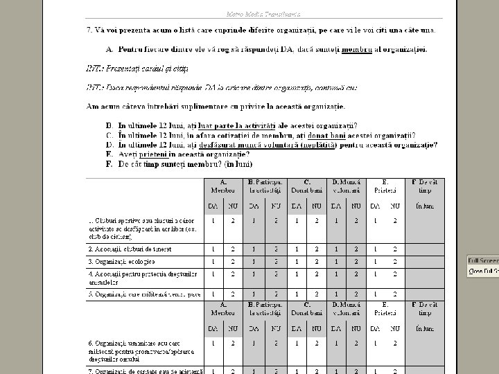Exemple de intrebari. Doar pentru cei care au făcut donaţii în ultimii doi ani (cel puţin un cod la Q 1, Q 3, Q 4, Q 6): Care au fost motivele pentru care aţi făcut donaţii? Dacă există mai multe motive, care au fost cele mai importante? (întrebare deschisă, operatorul înregistrează toate motivele prezentate de respondent şi va indica cel mai important motiv – treceţi principalul motiv pe poziţia 1). . . . . . . . . . . . . . . . . . . . . . . . . . În cazul firmei d-voastră, . . . 1. alocaţi o sumă / cantitate de bunuri fixă pe an, pentru donaţii. 2. alocarea donaţiilor pe an este flexibilă, însă se face în mod regulat 3. alocarea donaţiilor depinde în totalitate de împrejurări, nu are loc în mod regulat 3. altă situaţie. Vă rog să o descrieţi pe scurt: . . . . . . . . . . . . . . . . . . .