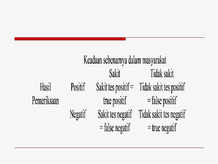 Contoh o Dari populasi 1000 orang diperoleh 100 orang mempunyai penyakit X sedang 900 orang tidak mempunyai penyakit X. Secrining dilakukan untuk mengidentifikasi 100 oarang yang mempunyai penyakit. Dari hasil pemeriksaan HB ternyata didapatkan 80 orang yang positif sedang 20 orang negatif. Dari 900 yang tidak sakit ternyata positif sebanyak 45 orang. Berapa sensitifitas dan spesifitas alat tersebut diata?