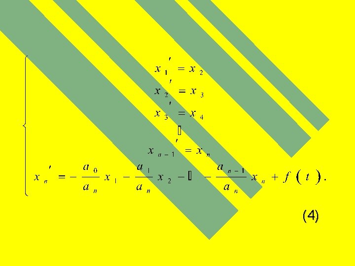 #ntr-adev[r, consider`nd ecuaia diferenial[: (1) ]i introduc`nd variabilele: , (2) rezult[ c[: (3) #n acest fel ecuaia diferenial[ de ordinul n scris[ sub forma (1) se poate echivala cu urm[torul sistem de n ecuaii difereniale de ordinul 1: