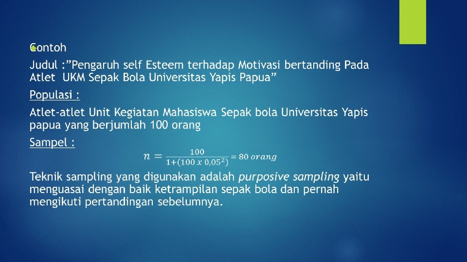 RUMUSAN MASALAH • Rumusan masalah sesuai dengan topic atau judul penelitian dan berdasarkan latar belakang masalah. Contoh : Judul : pengaruh pengembangan sumnber daya manusia terhadap produktifitass kerja karyawan PT. xxxxx di Jayapura Rumusan Masalah : 1) Apakah terdapat pengaruh pendidikan dan pelatihan terhadap produktifitas karyawan PT. XXXXX di Jayapura secara simultan ? 2) Apakah terdapat pengaruh pendidikan dan pelatihan terhadap produktifitas karyawan PT. XXXXX di Jayapura secara parsial ? 3) Variabel pengembangan SDM apa yang paling dominan mempengaruihi produktivitas karayawan PT. XXXXX di Jayapura ?